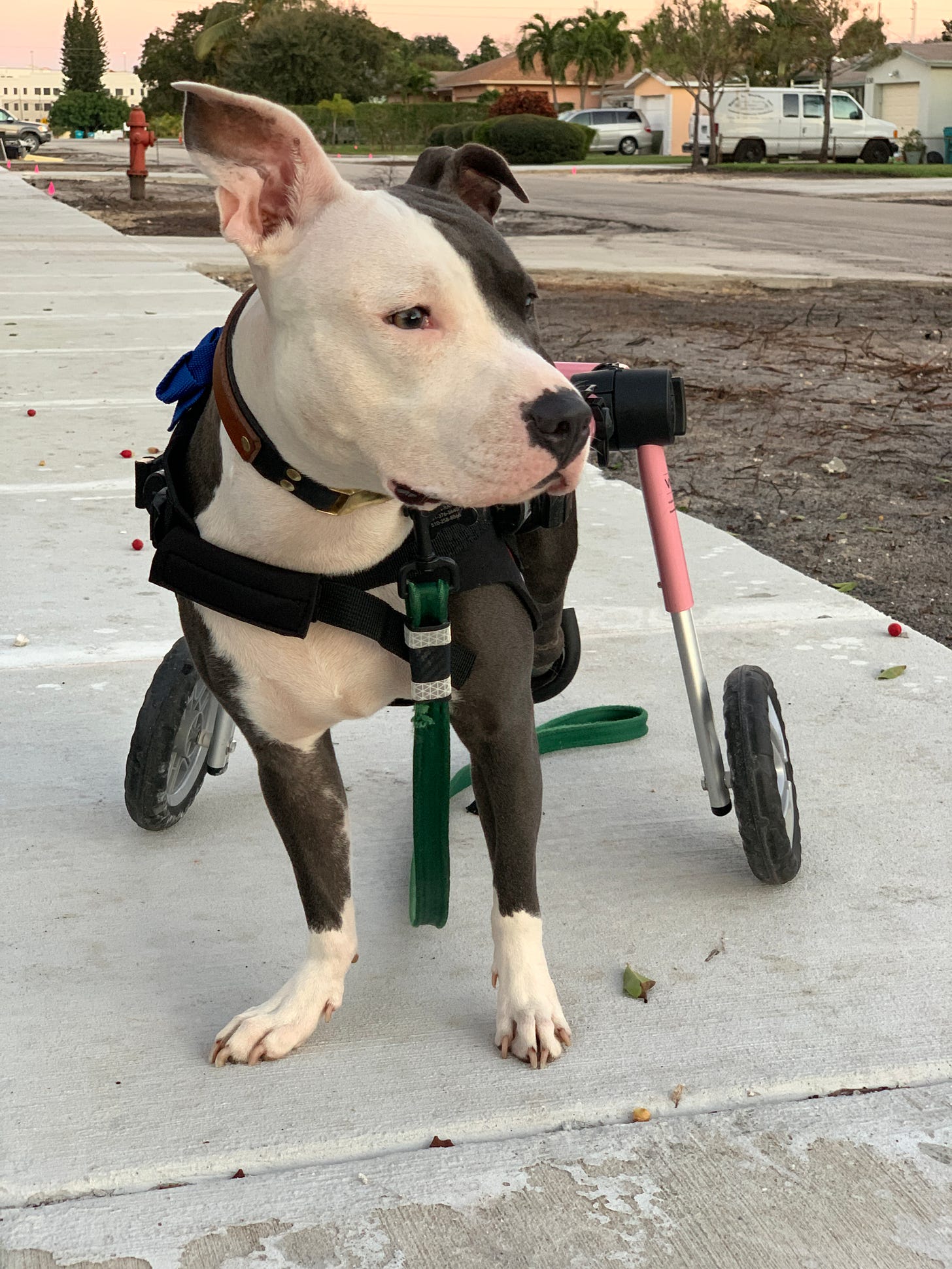 she was a pitbull, black and white with bright green starshine eyes and a lolling tongue that belied her easy-going attitude. she’d been surrendered to us by a family from the practice where derek works the rest of the time, when he isn’t performing end-of-life care, because she’d been injured and she couldn’t feel her back half anymore. after the injury, she needed crate-rest, and while in the crate she caught her foot between the wires and tore off her toes. the family couldn’t or wouldn’t manage the wound and eventually a doctor stepped in, when vix was burning hot to the touch with fever and her mangled foot was covered in a haphazard bandage and she’d lost too much weight and most of her will. this veterinarian said vix needed to be surrendered or euthanized but she wasn’t going back with them, so when the family threw up their hands and signed the paperwork to be done with the troublesome dog whose disabilities had ballooned far beyond what they expected from a puppy, we were the ones who welcomed her home.