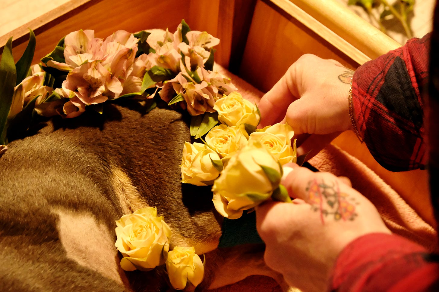 after roland died, we laid his body in a casket derek built by hand for the pets we euthanize in our work with our veterinary practice, which focuses on in-home euthanasia and was founded in 2017, after harper died (white fluff and unmitigated fury capped with wall-eyes and a tongue so long i’m certain it coiled around her brain like a woodpecker’s does. when did my life become a string of dead pets?) this casket has held many pets over three years, dogs and cats, all family, but this was the first time it held roland. i laid a quilt made of my softest old cotton t-shirts over him and tucked french fries around him, the ones he wouldn’t eat in the car home from the emergency vet because he felt like garbage warmed over an open flame in hell, and then i held onto him for three days.